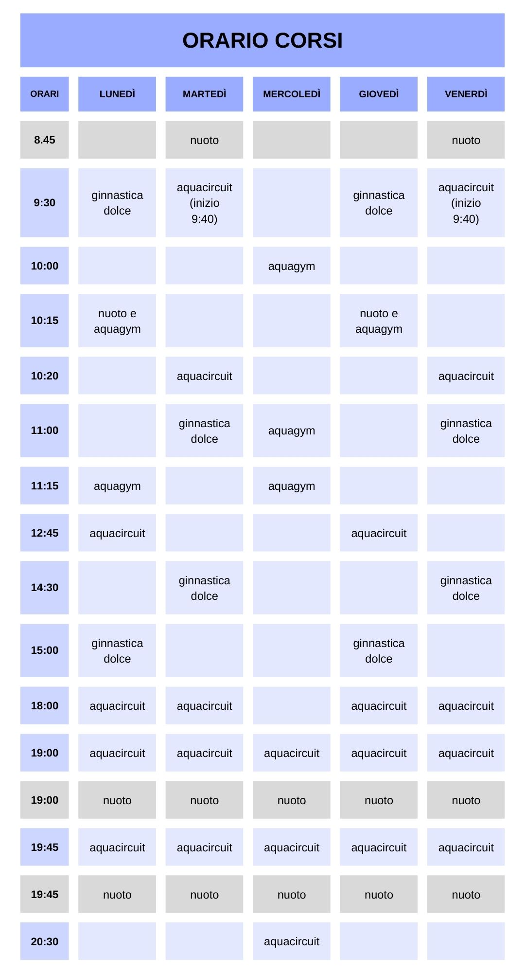 - Acquagym: un corso per tutti, un modo per mantenersi in forma divertendosi a ritmo di musica.